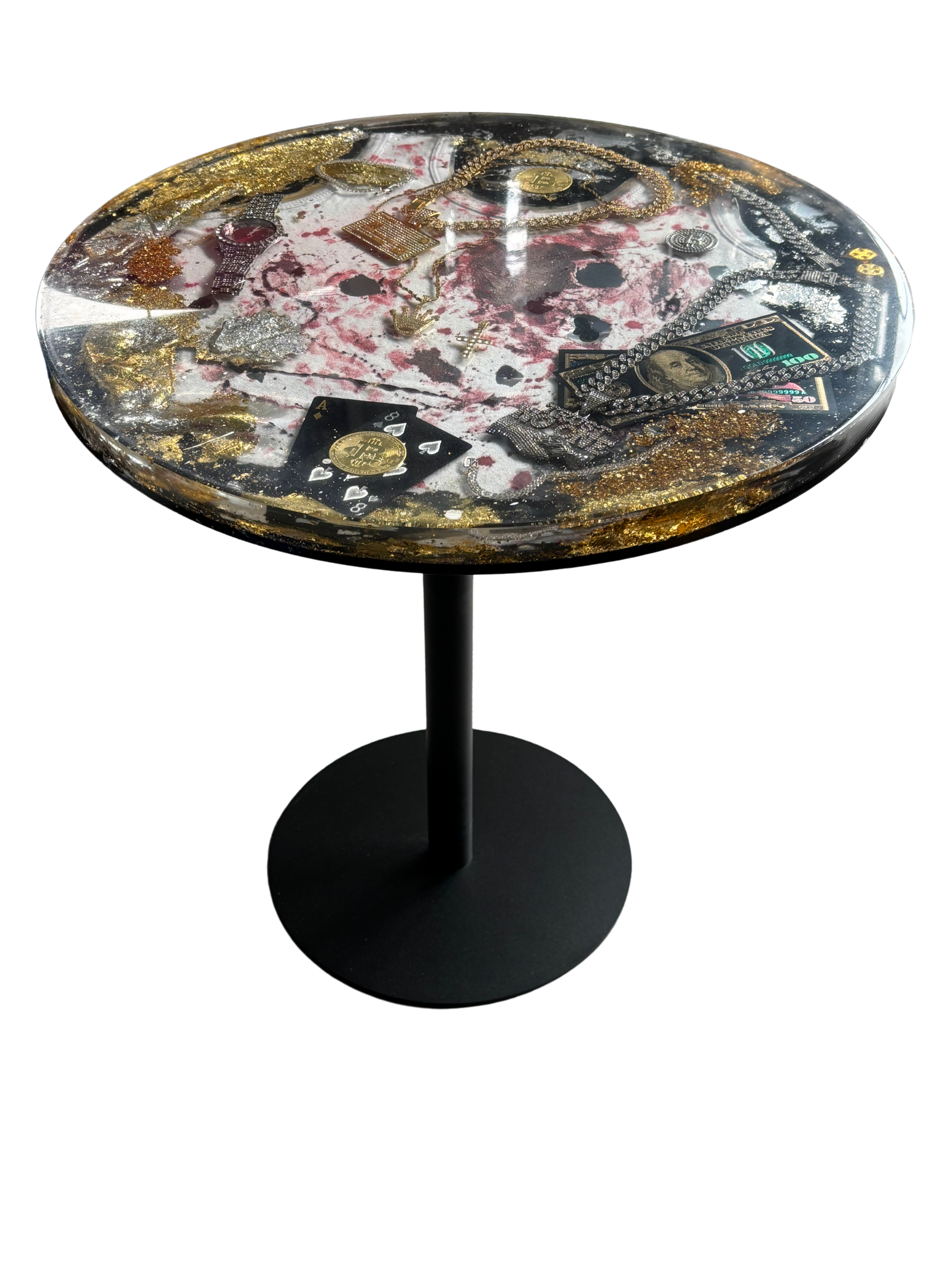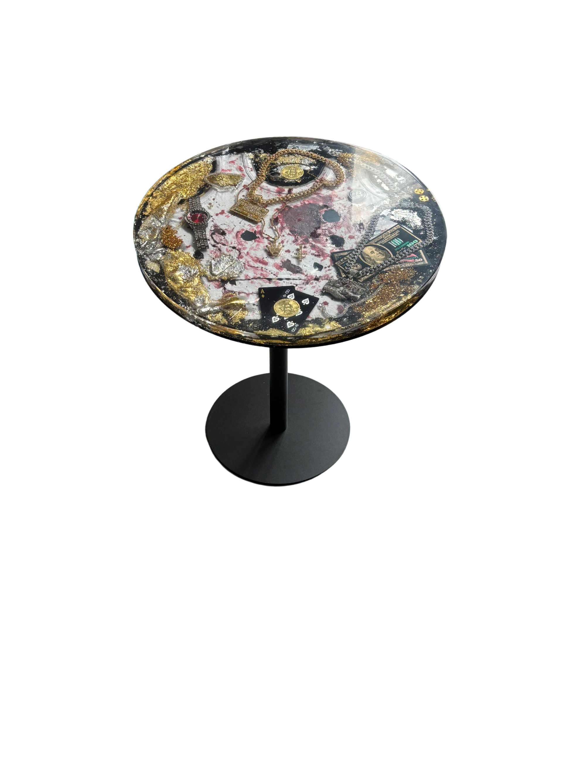 Im Zentrum: ein blutverschmiertes weißes Unterhemd mit Einschusslöchern – eingegossen in Epoxidharz, als Symbol für die Härte der Straße. Umgeben von Gold, Diamanten und Kryptogeld, erzählt dieses Werk eine Geschichte zwischen Macht, Geld und Gefahr.
